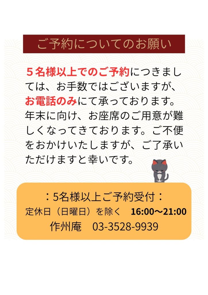 作州庵のご予約はお電話もしくはホットペッパーグルメでのオンライン予約で承っております。